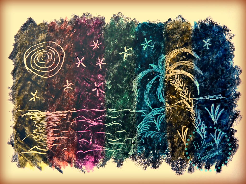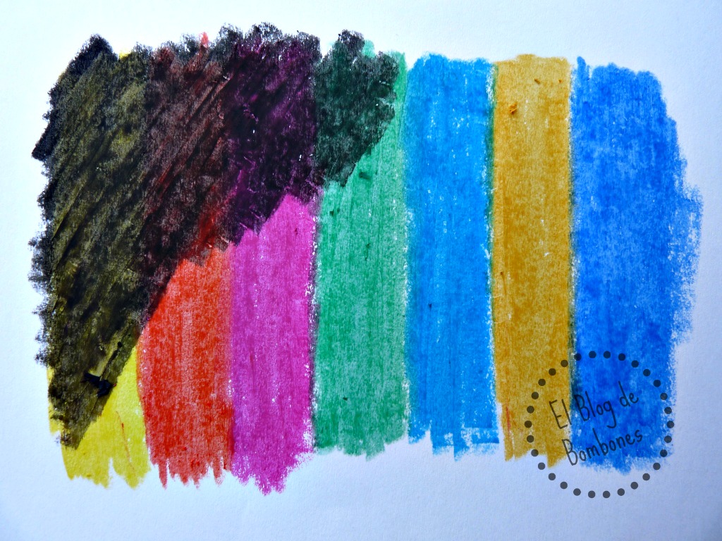 Necesitamos tener ceras blandas, de esas que manchan los dedos cuando pintas. Esto es importante, porque con otro tipo de cera no va a funcionar. Lo primero que hacemos es pintar una base de color. Y a continuación, cubrir todos los colores con negro.