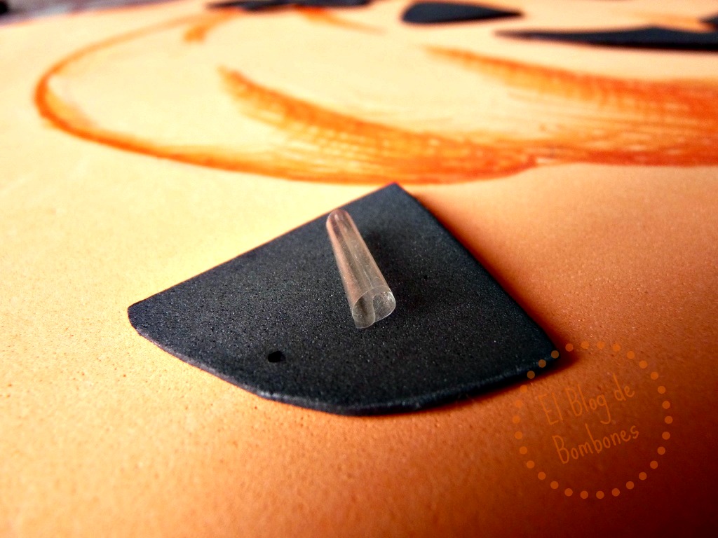 Este dibujo lo pasamos a una plancha de goma eva, y recortamos las plantillas de lo que sería luego la cara de la calabaza.