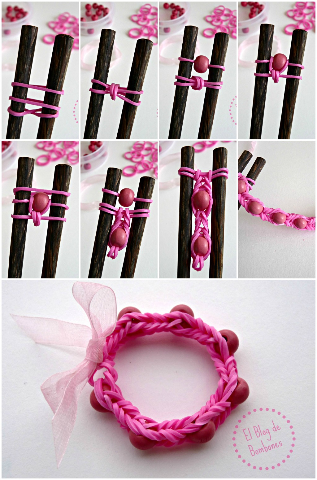 Os dejo aquí el paso a paso para hacer pulseras de gomitas o loom bands, a ver que os parece. Empezamos poniendo una goma cruzada. Para las siguientes ya no será necesario hacer esto. Tenemos que tener siempre tres gomitas en los palillos, e ir pasando por encima de la última que hemos añadido, la que hay más abajo. Así siempre, independientemente de que la última goma tenga o no una cuenta en el medio. El único secreto que tiene el incorporar cuentas a la pulsera es que entre cuenta y cuenta utilicemos siempre el mismo número de gomas (en el caso del tutorial, hay cuatro gomas entre cuentas).