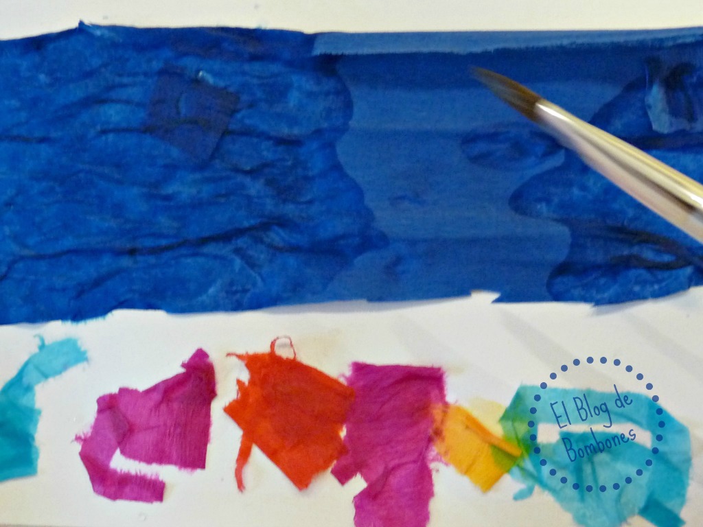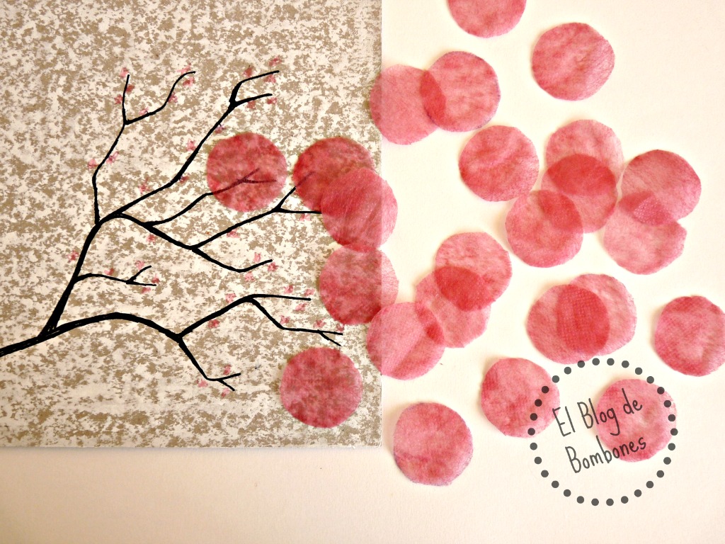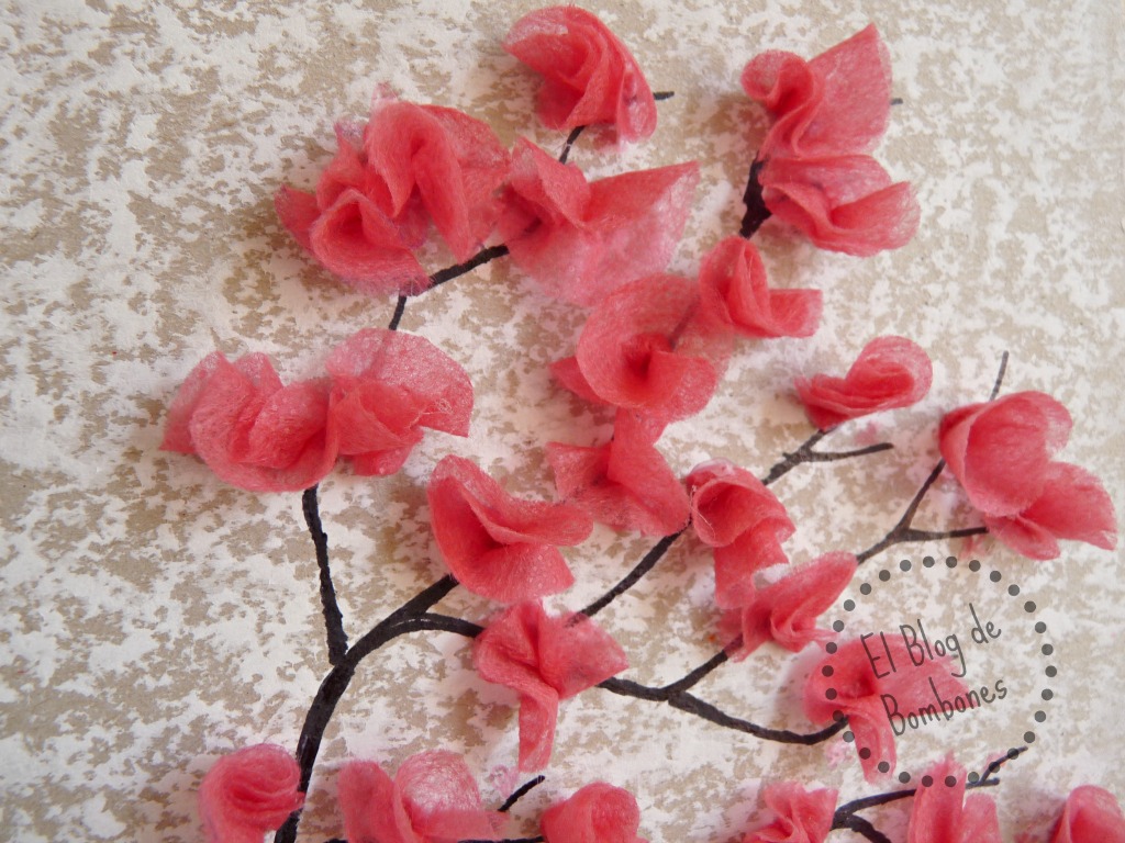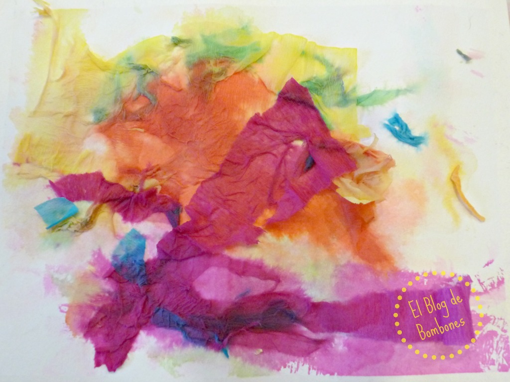En la foto de los materiales me he dejado el 50% en el tintero, el alcohol y el separador de las dos telas, pero al menos en una de las flores estuve al tanto para poder sacar un par de fotos y que os hagáis una idea de cómo se van pintando solas. Atentos a esto, porque los peques alucinan cuando ven los colores en movimiento.