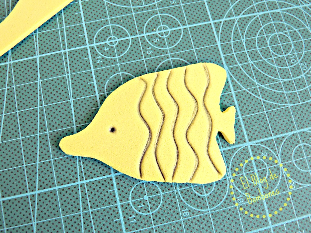 La idea original era quedarnos con los peces ‘planos’. Una vez tenemos la silueta recortada ya se podría usar como sello, pero os recomiendo que os hagáis con algo para empezar a dibujar en él. Un punzón, un palillo, o un simple lapicero pueden valer. Esto, con permiso de los que hacéis verdaderas virguerías con el carvado de sellos, se podría decir que puede ser la iniciación al carvado de los más chiquitines. Sin gubias, sin planchas de carvado, y sin gomas de borrar. Todo con materiales que es fácil tener a mano, como nos gusta.