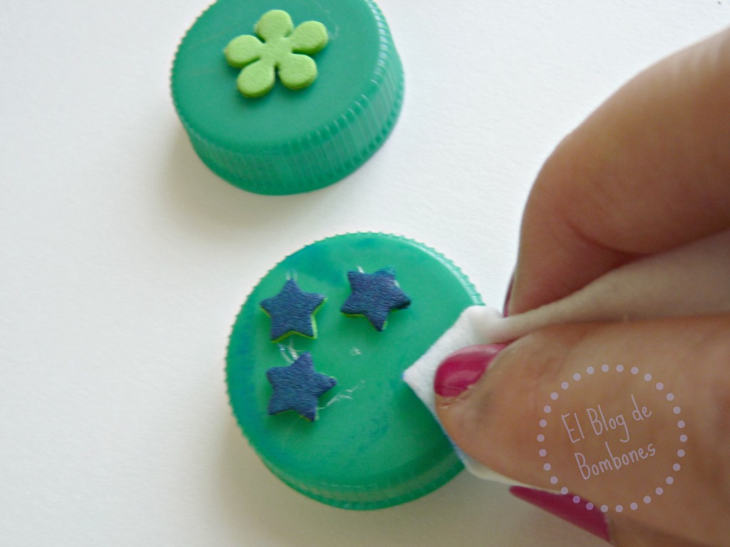 Para hacer los dibujos, yo he usado un lapicero con la punta bastante desgastada. Como veis, todo super sofisticado, jeje. Me apetecía que las marcas que hicese no fuesen muy finas, y que además se quedasen dibujadas en los sellos. Hay que apretar para hundir la goma donde queremos tener las marcas. Es así como hice la colección que veis en la primera foto. Son sellos un poco grandes, no es tan fácil encontrar una tapa para pegarlos como hicimos en la manualidad de hace unos días, pero tampoco es necesario.