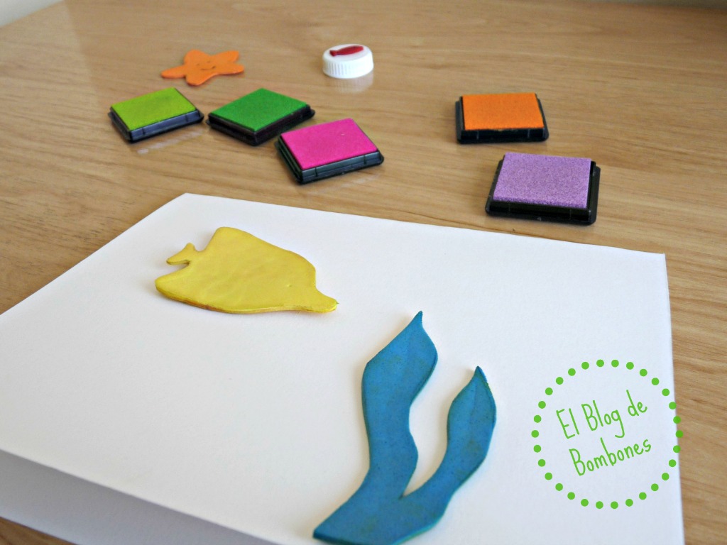 Si os gusta la idea de dar color a vuestros dibujos y no tenéis tintas de colores, que puede ser, podéis usar también pintura para dedos. Lo único a tener en cuenta en este caso, es que los detalles que habréis dibujado en vuestros peces, no se van a distinguir tan bien como si usaseis tinta. Yo trabajaría sólo con las siluetas de los peces, o los cubriría con una capa muy, muy finita de pintura antes de estampar. Cuestión de probar. ¡Y recordad siempre que las manualidades nunca salen mal!