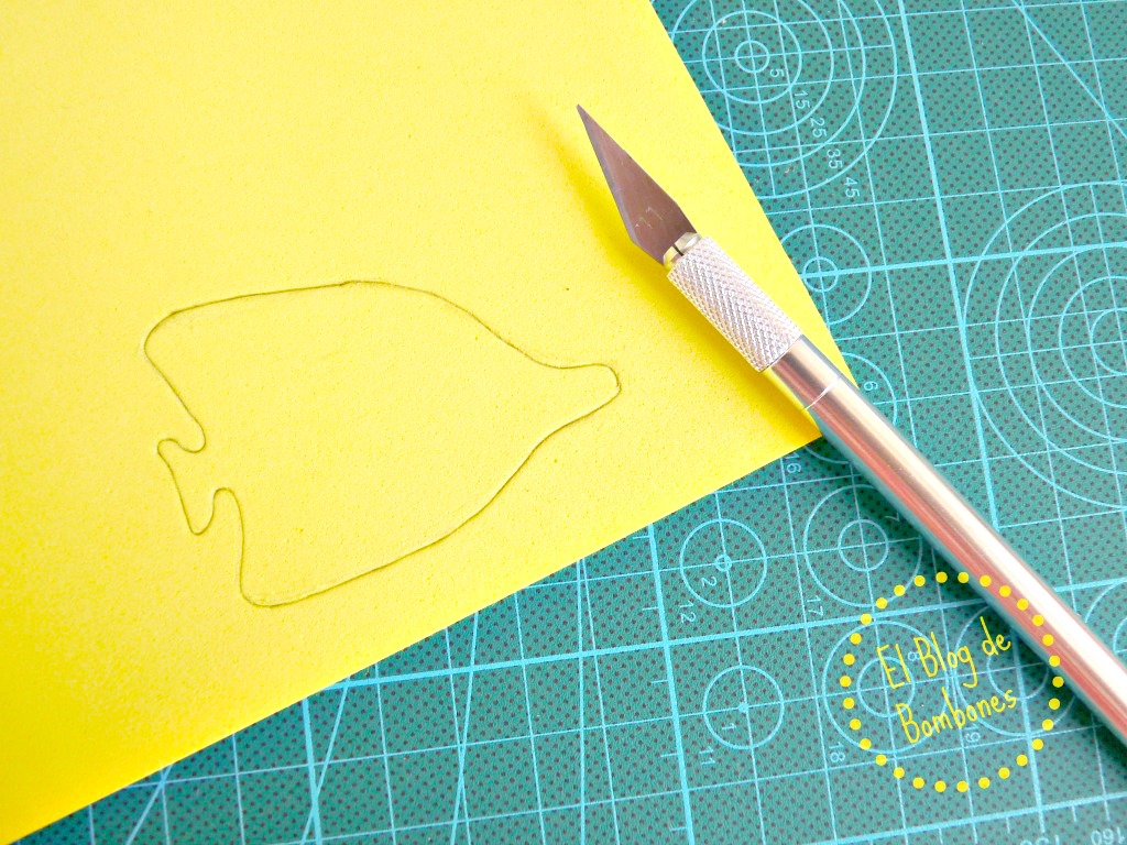 Pensé hacer siluetas de peces, algo veraniego, y usarlas para pintar acuarios. Una manualidad muy chula y con posibilidades infinitas para dibujar el fondo del mar. Sólo se necesita goma eva, tijeras o un cutter y un lapicero. ¡Ánimo, que peces hay de todas las formas, tamaños y colores! Ahí va el paso a paso de cómo hice el primero.
